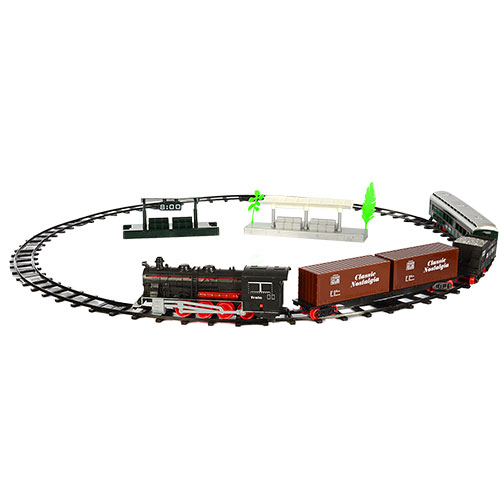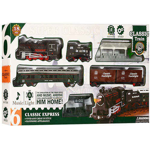 у наборі: локомотив – звук, світло, вагон – 3 шт., вокзал, 18 деталей.
