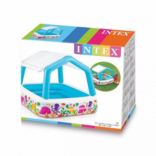 Дитячий надувний басейн Intex 57470 з надувним знімним дахом стане незамінним у літню спеку. Цей басейн дуже зручний за рахунок того, що має мобільний дах, якщо в літній спекотний день нестерпно пече сонце, то дах буде необхідністю, щоб уникнути перегріву дітей, а якщо день теплий, але сонечко ховається там, то дах можна зняти.