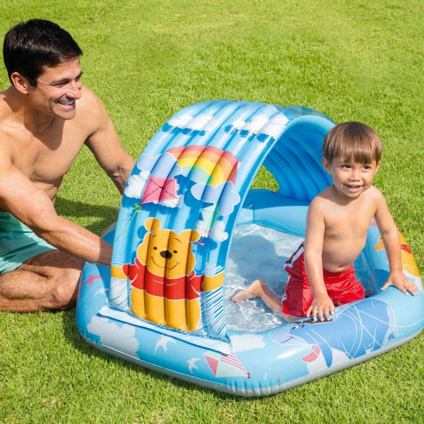 Басейн з м'якою надувною підлогою та вбудованим надувним навісом. Намальовані героя мультфілму Вінні-Пух зображені на стінах і бортах басейну. Басейн має м'яке дно, на якому так приємно сидиться дитячій попці. Навіс захистить ніжну шкіру дитини від перегріву та опіків.