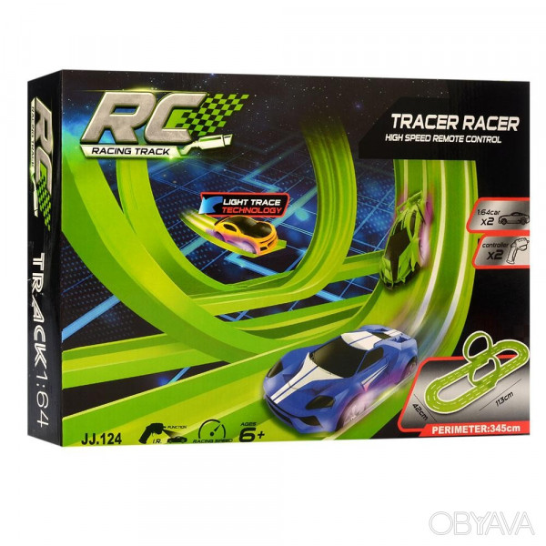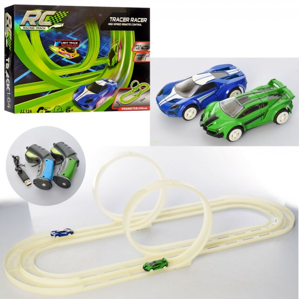 У комплекті: деталі для збирання треку, машинки 2 шт, пульт 2 шт, USB заряджання.