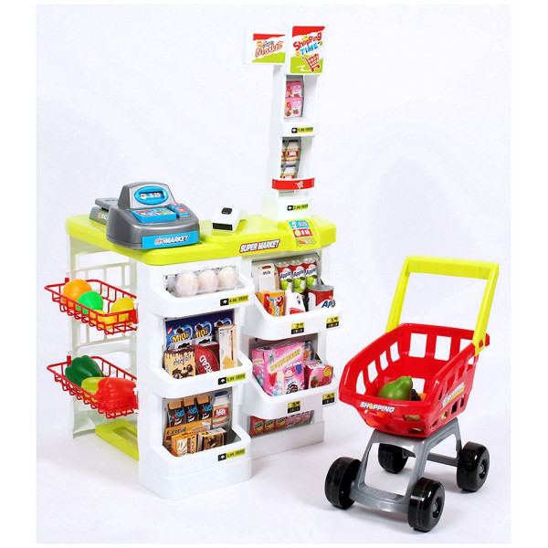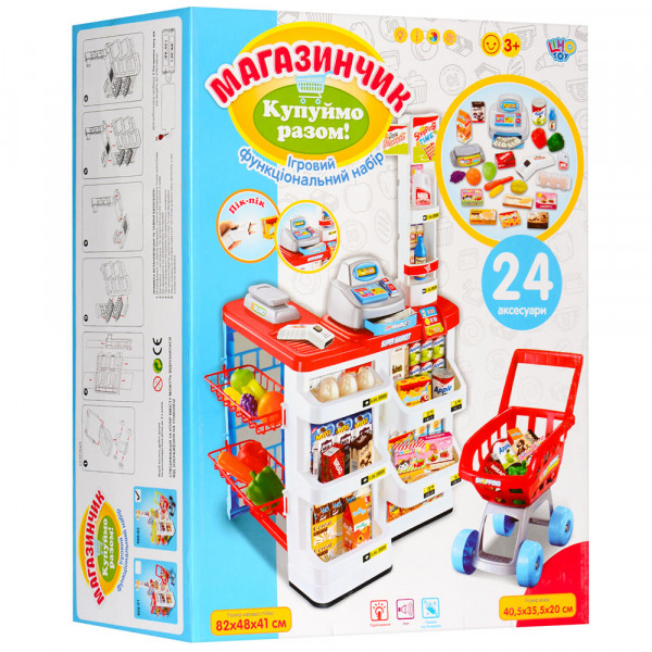 Супермаркет з візком включає все необхідне для гри в супермаркет. Дитина знайде в наборі візок для покупок, і самі продукти, і касу з прилавком. Велика стійка має кілька кювет для розкладки товару, а для покупця — візок на коліщатках з ручкою.