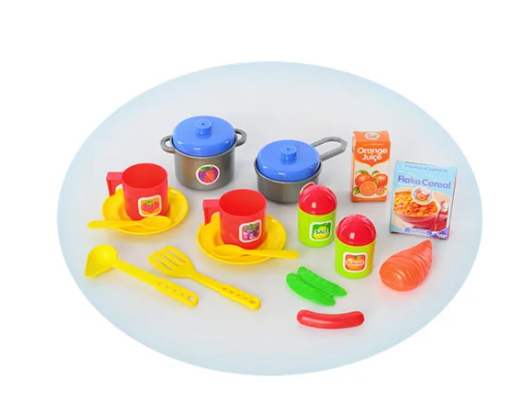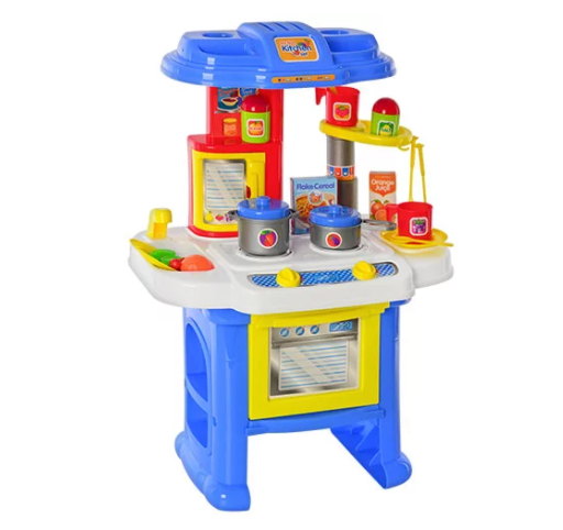 У комплекті є набір приладдя для Вашої дитини: 2 шт. каструлі, чашки, тарілки, кухонний набір. Є витяжна шафка з гачками для половника та лопаточки. І шафка з двома поличками для спецій.