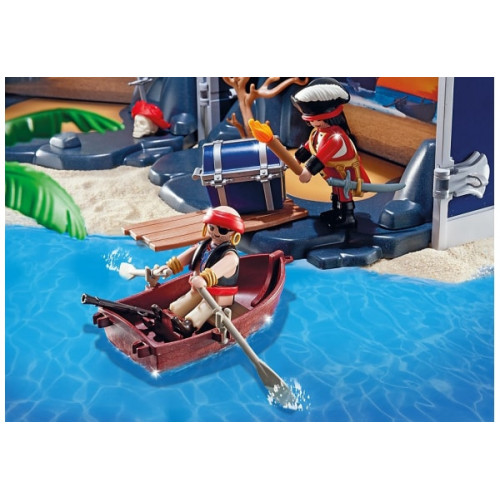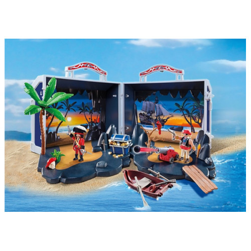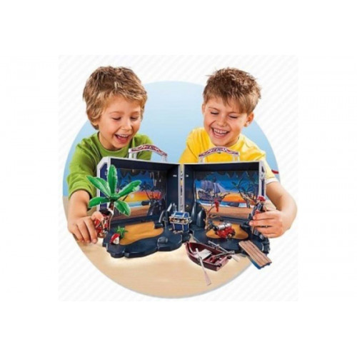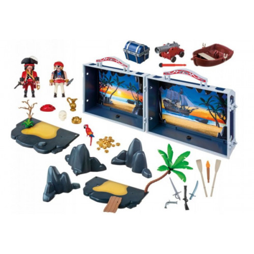У зручній валізці, оформленій у вигляді піратської скрині, ігровий набір зручно зберігати і переносити, а в розкритому вигляді чемодан стає декорацією у вигляді тихої бухти з печерою, де пірати ховають свої скарби. Для більшої правдоподібності на сцену слід додати інші декорації з набору - камені і пальму.