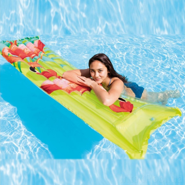 Надувний матрац, виготовлений з тонкого напівпрозорого вінілу, має яскраве забарвлення. Відмінно підійде для відпочинку на пляжі та плавання. Для безпеки ретельно проклеєні подвійні шви та матрац з подушкою надуваються незалежно один від одного.