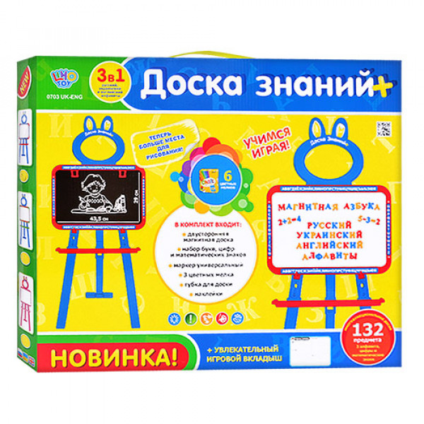 Мольберт - це дуже зручний і цікавий пристрій для навчання дитини дошкільної інформації. Мольберт Joy Toy 0703 допоможе Вашим дітям в ігровій формі вивчити літери двох алфавітів (російську, українську, англійську), цифри та математичні знаки, а також розвинути навички малювання. Можливість малювання з двох боків: з одного боку крейдою, з іншого боку – маркером.