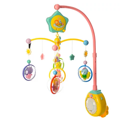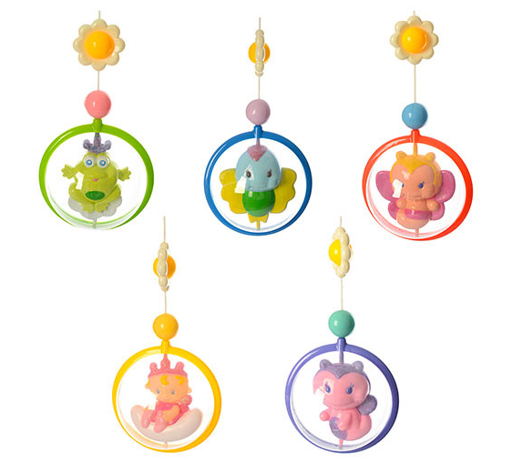 Іграшки повільно крутяться, притягуючи до себе погляд дитини, що стимулює візуальну реакцію.