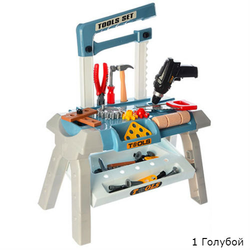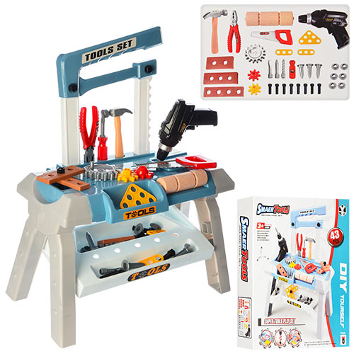 Комплектація: верстат; електродриль (батарейки до комплекту не входять); пила; молоток; пасатіжі; викрутка; всього 43 деталі.